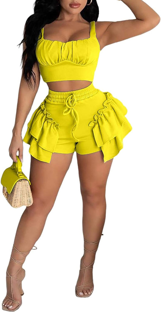 Women'S Sexy Two Piece Outfits Solid Sleeveless Crop Top Short Pants Sets Bodycon Romper Streetwear Yellow XL